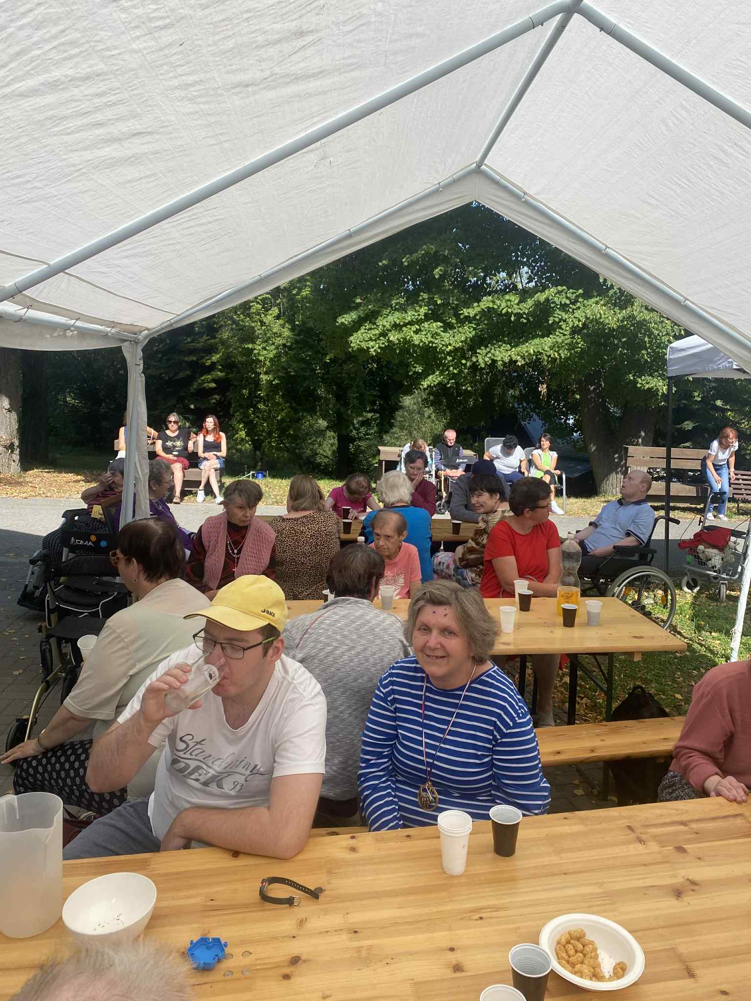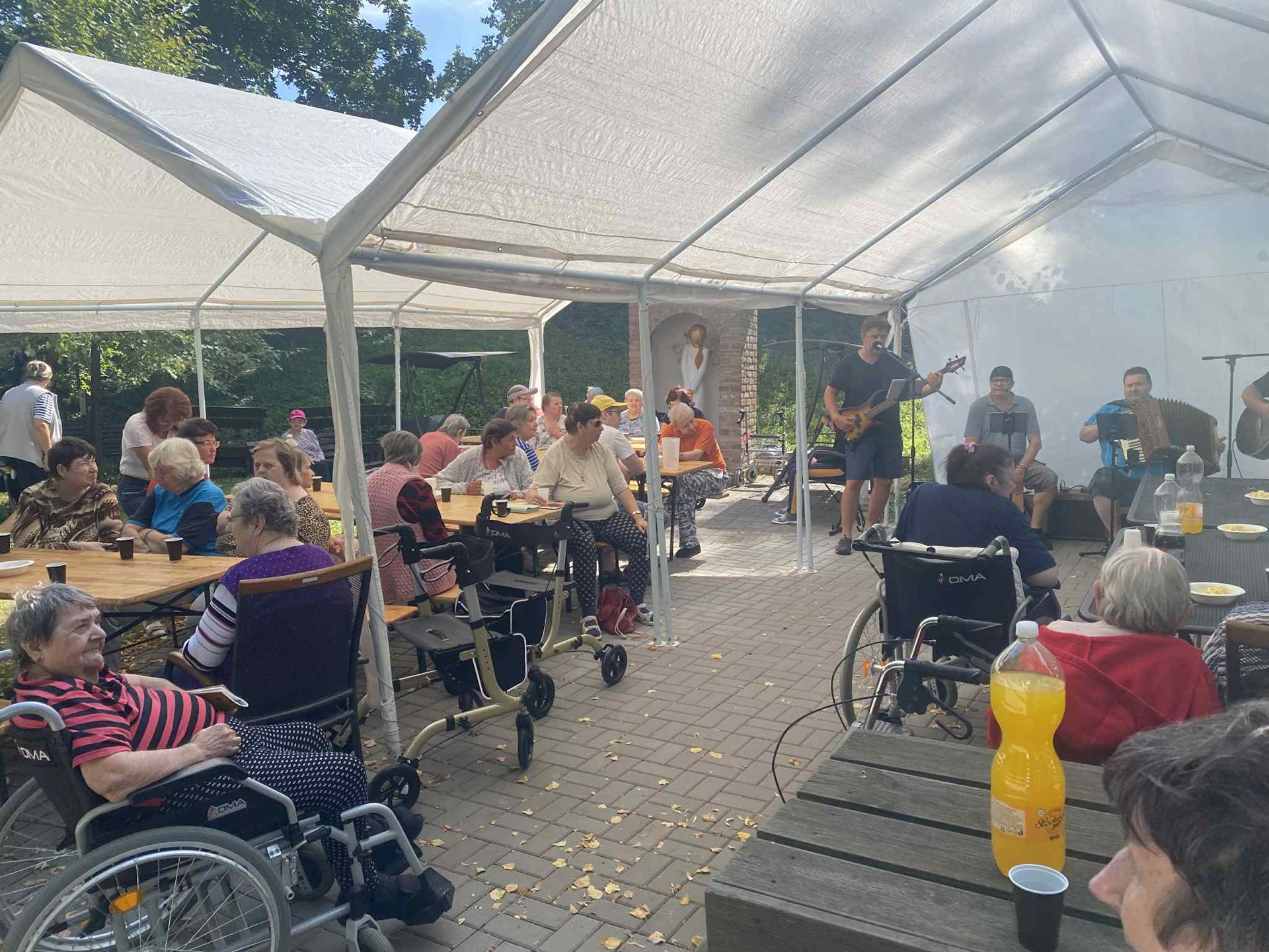 Odpoledne v parku patřilo hudbě, radosti a přátelské atmosféře. Pan ředitel se svou kapelou rozezpívali kytary, harmoniku i nás všechny kolem.